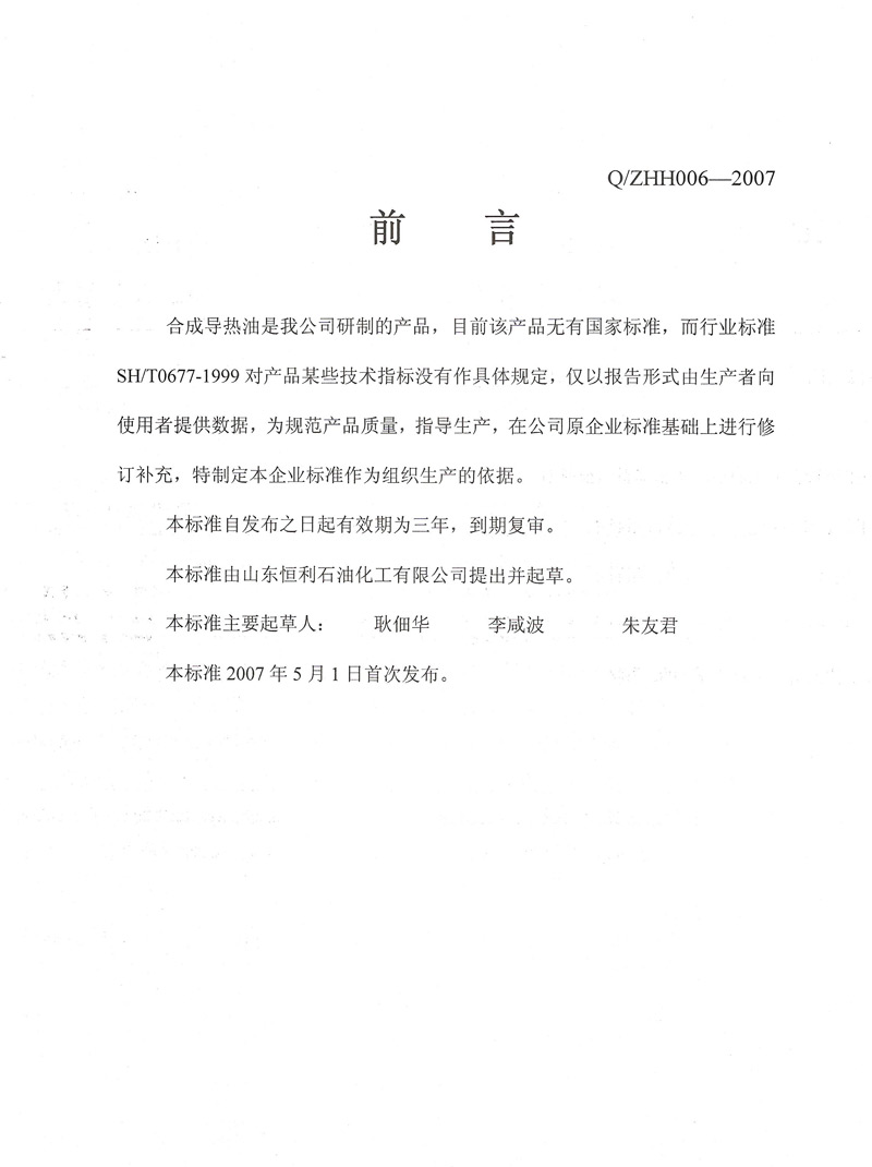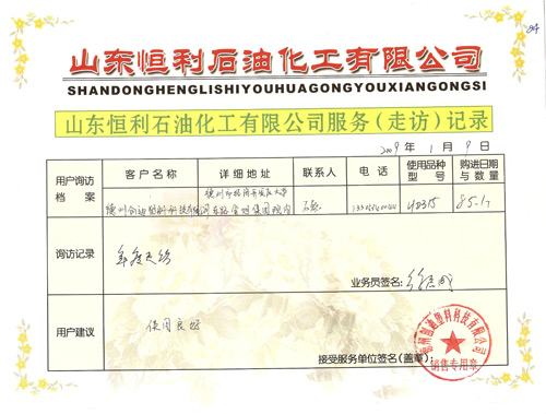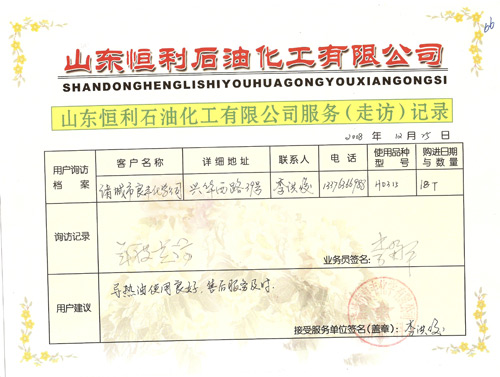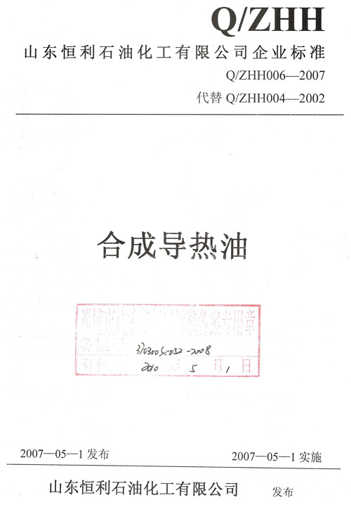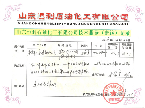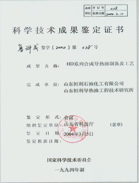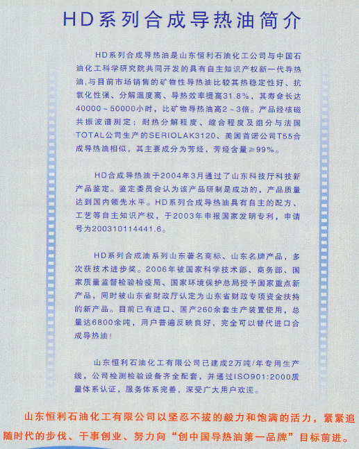 HD系列合成型导热油产品投产后,经山东莱阳鲁花特浓花生油有限公司,大庆石化炼化公司,江苏中能硅业科技发展有限公司,临沂中食机械厂,东营万德福植物蛋白有限公司,青岛三才公司等用户使用,普遍反映合成导热油热稳定性好,使用寿命长,为用户节省了换油、洗炉时间和资金,社会效益相当显著。HD系列合成型导热油的研制开发成功,将逐步替代矿物型导热油。目前TOTAL公司深圳办事处代理商与本公司签订合同将经销HD系列合成型导热油,我们坚信HD系列合成型导热油的推广使用将进一步促进我国有机热载体事业的发展。