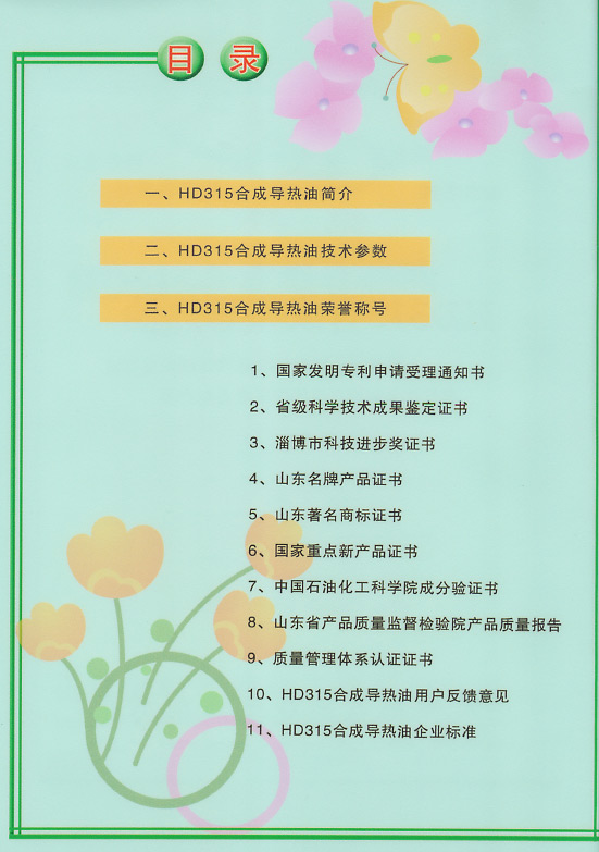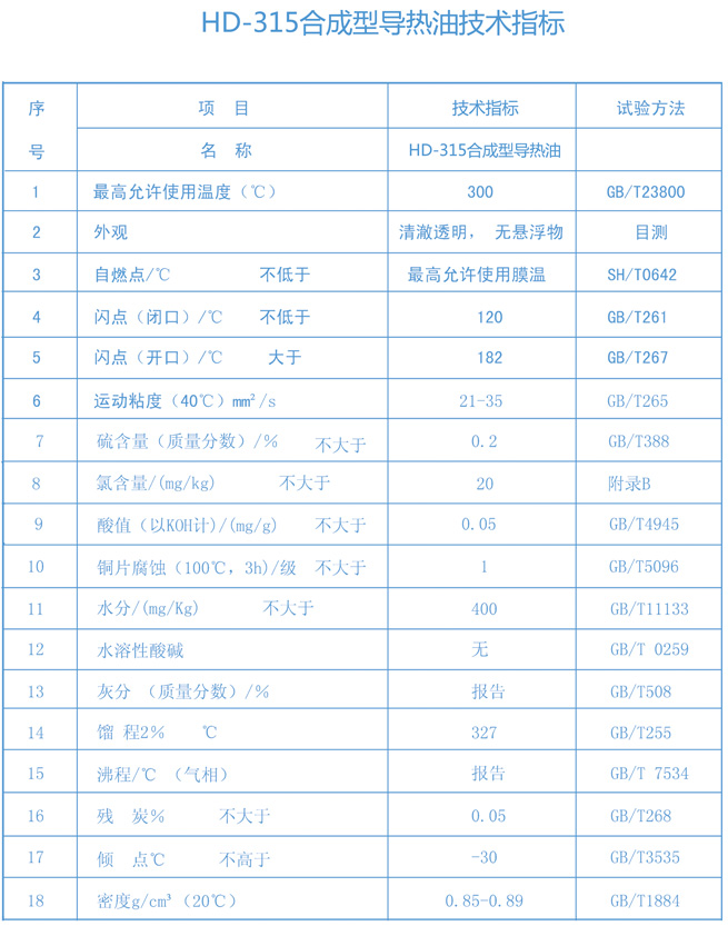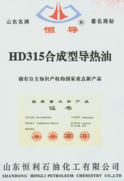 HD系列合成型导热油是山东恒利石油化工股份有限公司在中国工程院汪燮卿院士支持下,与中国石油化工科学研究院共同研究开发的具有自主知识产权新一代导热油,与目前市场销售的矿物性导热油比较,其稳定性好、抗氧化性强、分解温度高、导热效率提高31.8%,其寿命长达40000-50000小时,(氮封)比矿物油高2-3倍。产品经核磁共振波谱测定耐热程度高、缩合程度及组分与法国TOTAL公司生产的SER10LAK3120、美国首诺公司T55合成型导热油相似,其主要成分为芳烃,芳经含量》≥99%。 HD-315合成型导热油于2004年3月通过了山东省科技厅科技产品鉴定。鉴定委员会认为该产品研制是成功的,产品质量达到国内领先水平。HD-315系列合成型导热油具有自主的配方、工艺等自主知识产权,于2008年获得国家发明专利,专利号为ZL200310114441.6。 HD-315系列合成型导热油被评为2005年山东省著名商标、山东省名牌产品、中国驰名商标,多次获得省市技术进步奖。2006年被国家科学技术部、商务部、国家质量监督检验检疫局、国家环境保护总局授予国家重点新产品,同时被山东省财政厅、为山东省财政专项资金扶持的新产品,目前已有进口、国产260余套生产装置使用总量达6800余吨,用户普遍反映良好。 HD-315系列合成型导热油产品技术水平达到国内领先水平,产品接近进口导热油K3120水平,可以替代T66、K3120D等进口产品。 HD315合成导型热油委托中国石油化工科学院进行馏分烃类组成分析,其结果总芳烃含量为100%,其中单环芳烃占87.9%,双环芳烃占9.3%,三环芳烃占1.7%,四环芳烃占1.1%。由此可见,HD315合成型导热油其热稳定性好,使用寿命长,同时公司又委托中国石油化工科学研究院与TOTAL公司生产的K3120合成型导热油进行全性能对比检测,认为:HD315合成型导热油结构组分与K3120非常相似,其热稳定性,馏程温度范围,纯度与K3120接近,可以完全替代K3120、T55等型号的进口合成导热油。