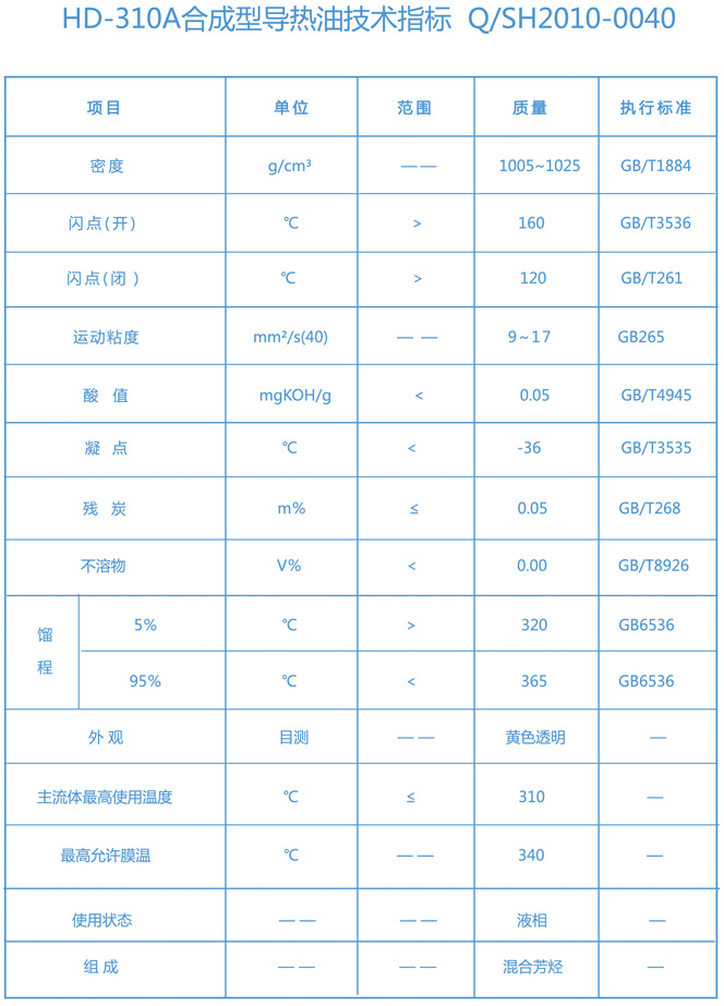 HD-310A合成型导热油是在HD-315导热油的基础上采用我公司自主研发的专利技术一种工业用合成导热油及其制备方法(专利号ZL200310114441.6),研制出来的合成型导热油,其结构与HD-315基本相同,但三苯类化合物要比HD-315含量高,因此其耐高温性能比较高,可长期运转,使用寿命长。HD-310A合成型导热油与HD-315合成型导热油一样,应用领域非常广,是在-30-310℃条件下理想的首选合成导热油。